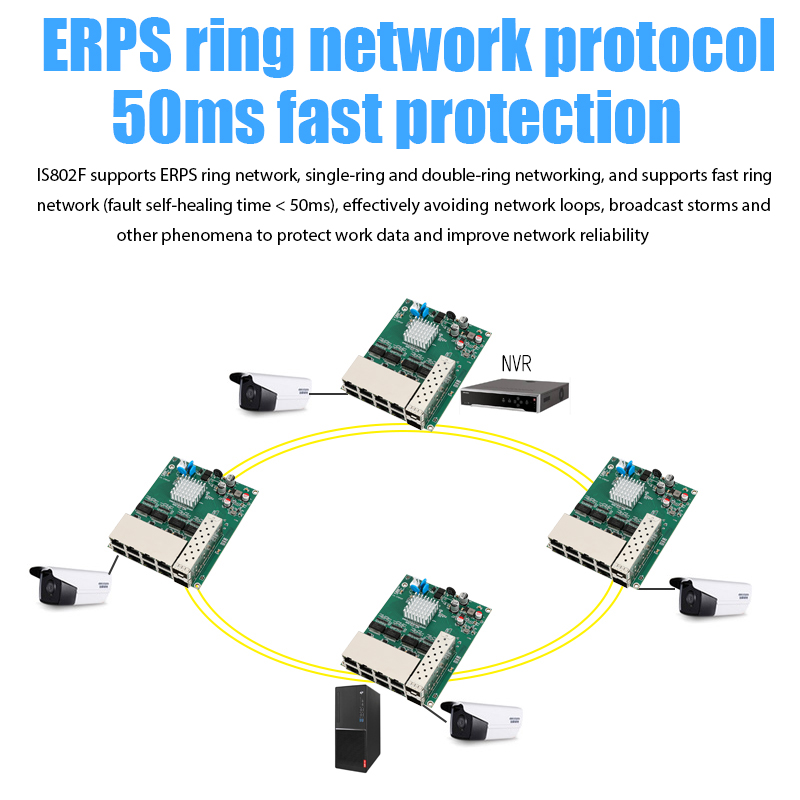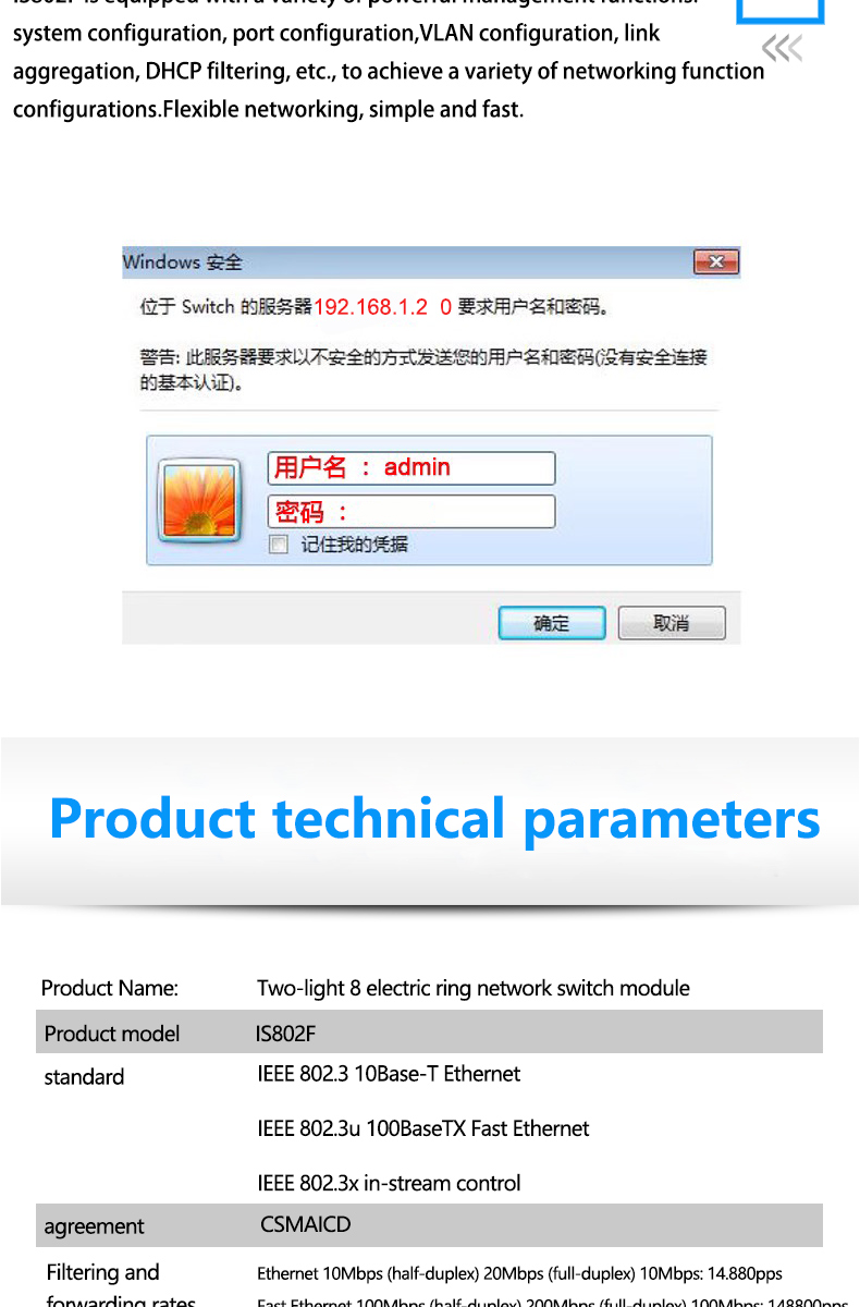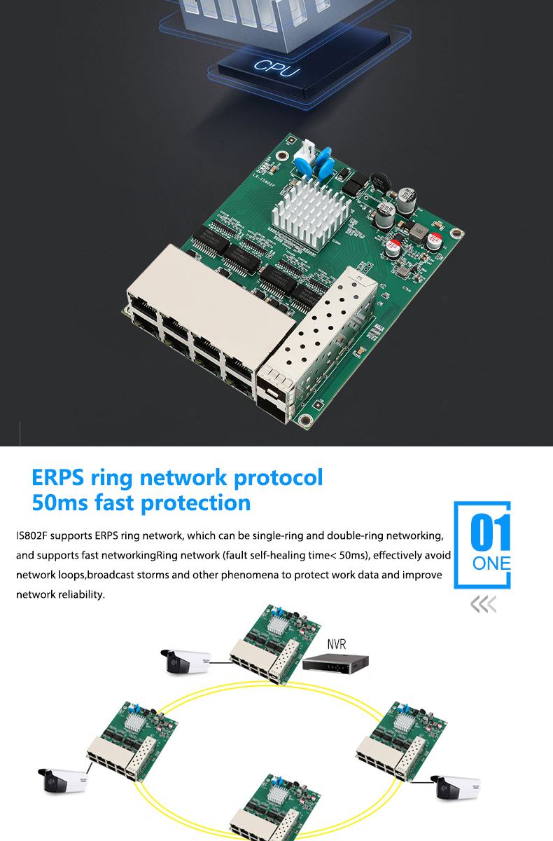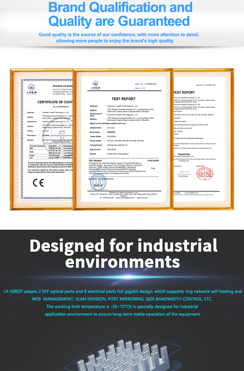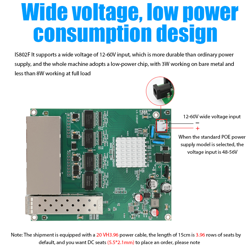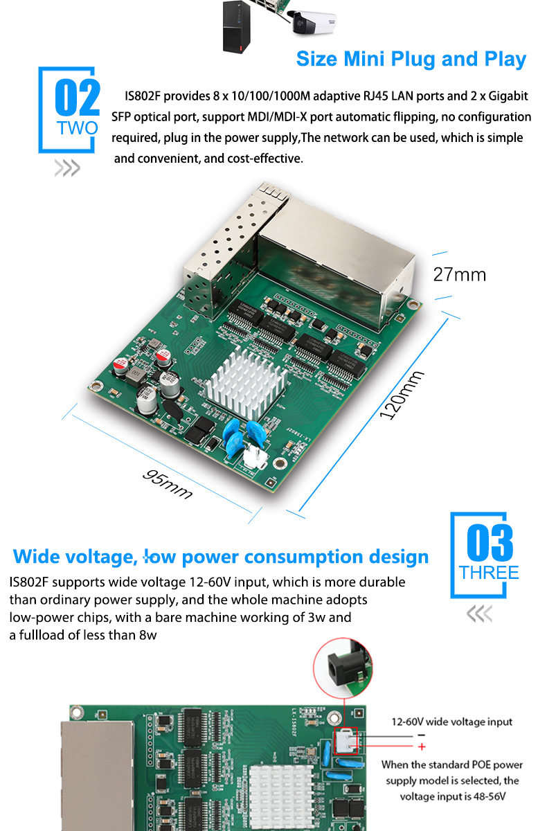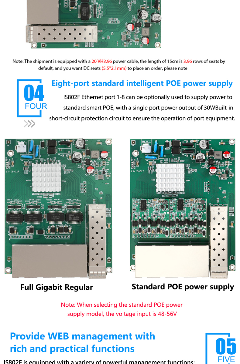 IS802F series are unmanaged full Gigabit PoE switch modules independently developed by HUASIFEI, with two full Gigabit adaptive electrical ports and two Gigabit adaptive electrical ports. The 3-4 ports support IEEE 802.3af/at standard PoE power supply, and the single-port PoE power reaches 30W. As a PoE power supply device, it can automatically detect and recognize the powered devices that meet the standard, and supply power to them through the network cable. Through the network cable for wireless AP, network cameras, network telephone, visual intelligent building intercom and other POE terminal equipment power supply, to meet the demand for high-density PoE power supply network environment, suitable for hotels, campuses, parks, scenic spots, supermarkets, factories, dormitories and small and medium-sized enterprises to set up cost-effective network. Non-network management model, plug and play, no configuration, easy to use