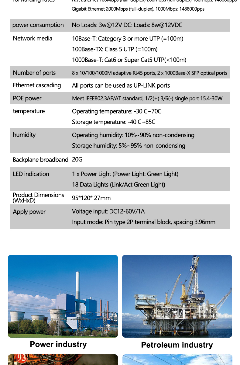 8 × 10/100/1000Base-T Ethernet ports (Data/Power) 2 × 1000Base-X SFP uplink fiber optic slots (Data) |