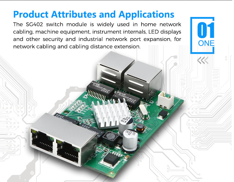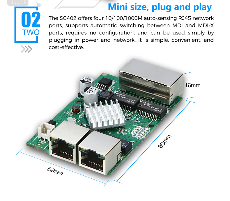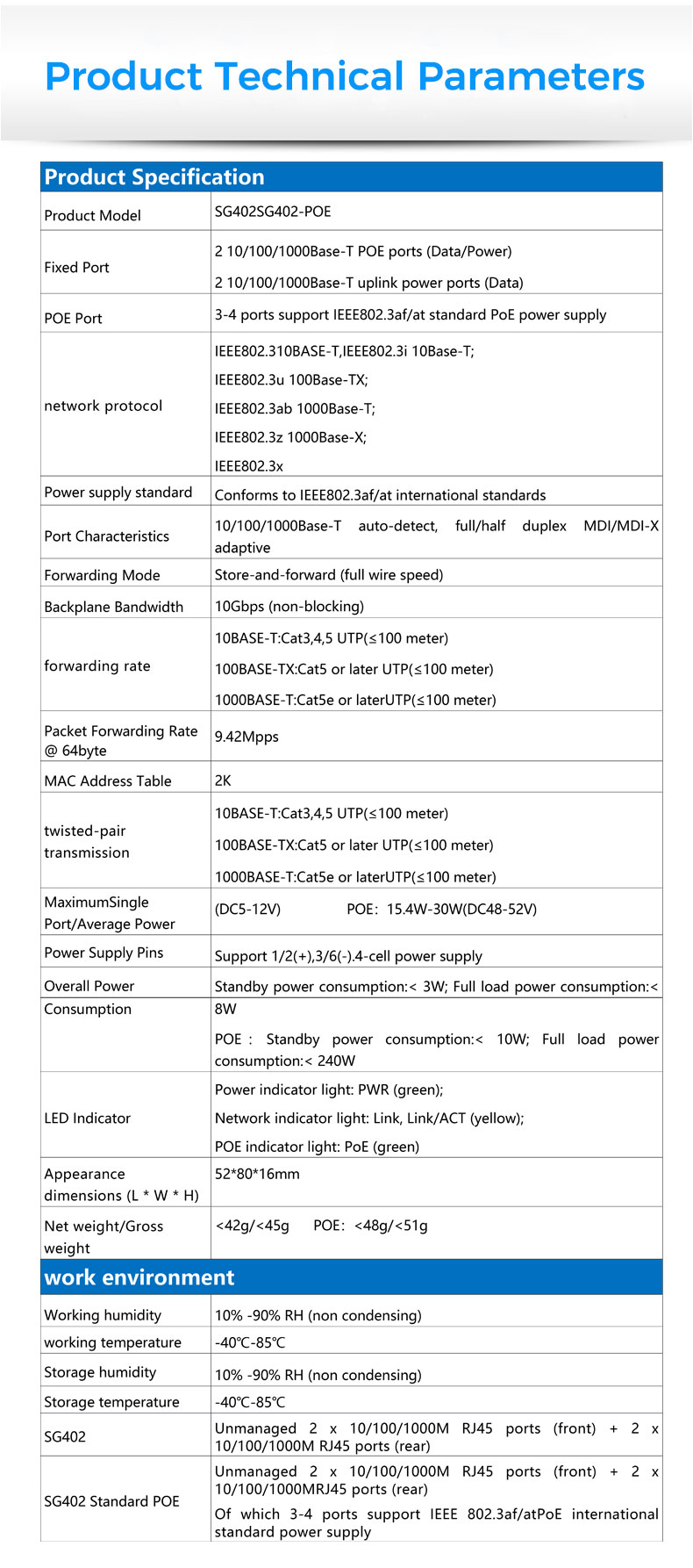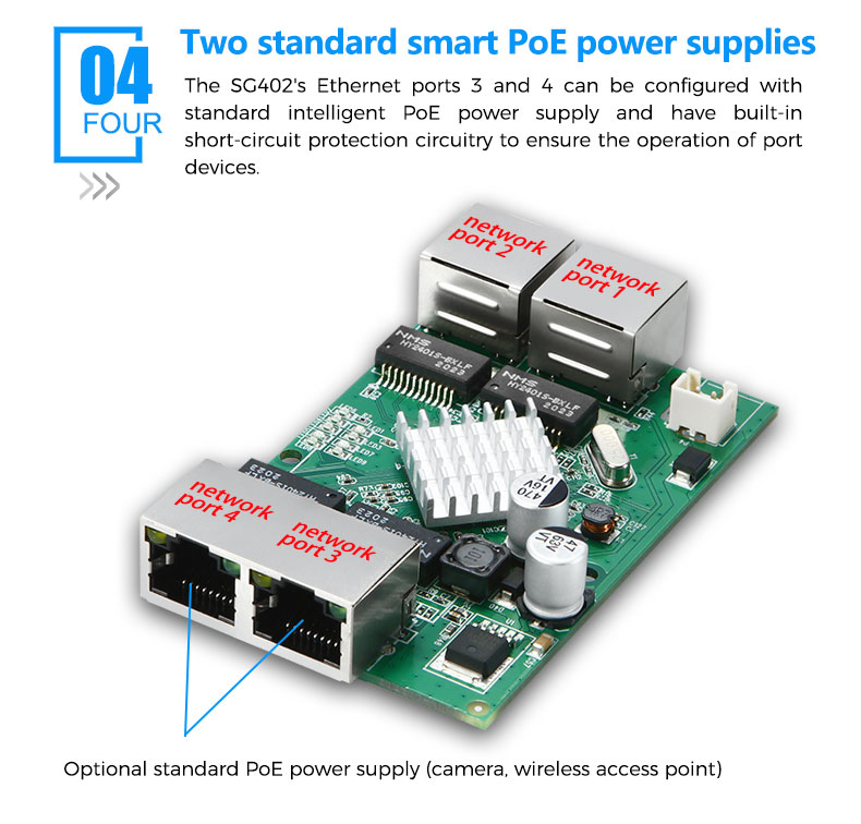 SG402 series are unmanaged full Gigabit PoE switch modules independently developed by HUASIFEI, with two full Gigabit adaptive electrical ports and two Gigabit adaptive electrical ports. The 3-4 ports support IEEE 802.3af/at standard PoE power supply, and the single-port PoE power reaches 30W. As a PoE power supply device, it can automatically detect and recognize the powered devices that meet the standard, and supply power to them through the network cable. Through the network cable for wireless AP, network cameras, network telephone, visual intelligent building intercom and other POE terminal equipment power supply, to meet the demand for high-density PoE power supply network environment, suitable for hotels, campuses, parks, scenic spots, supermarkets, factories, dormitories and small and medium-sized enterprises to set up cost-effective network. Non-network management model, plug and play, no configuration.