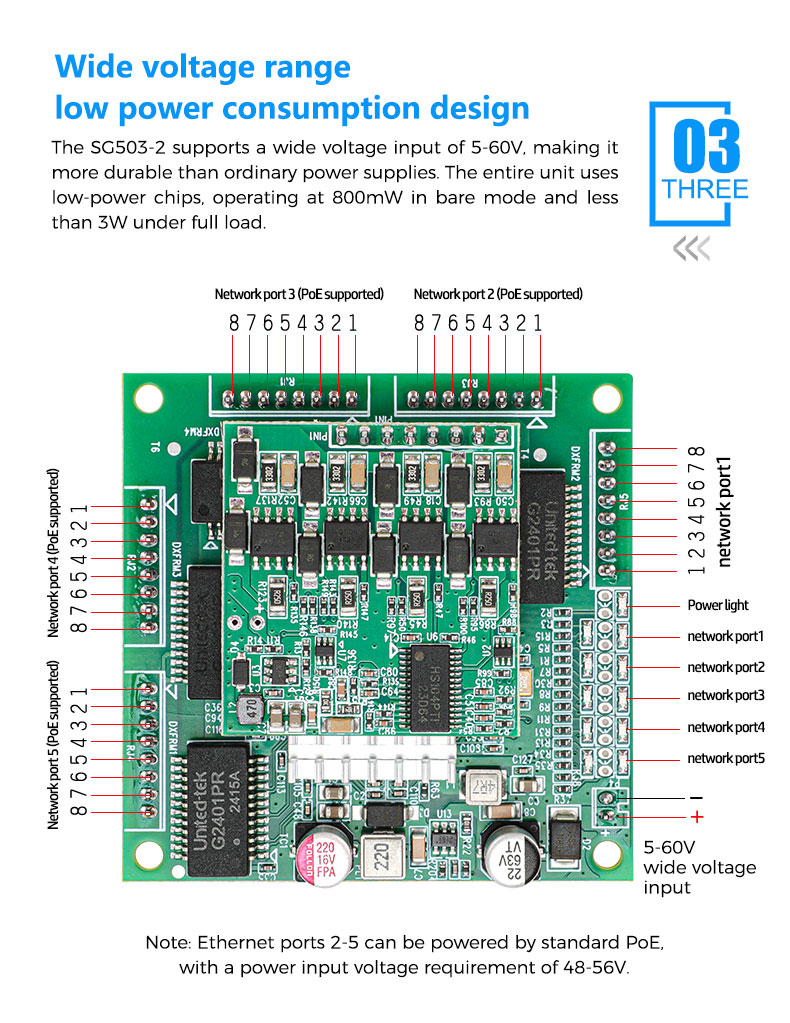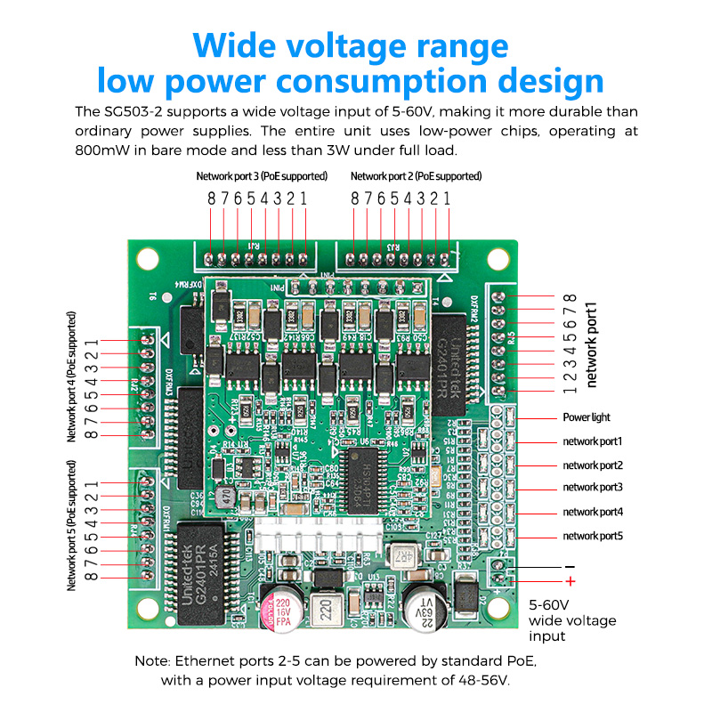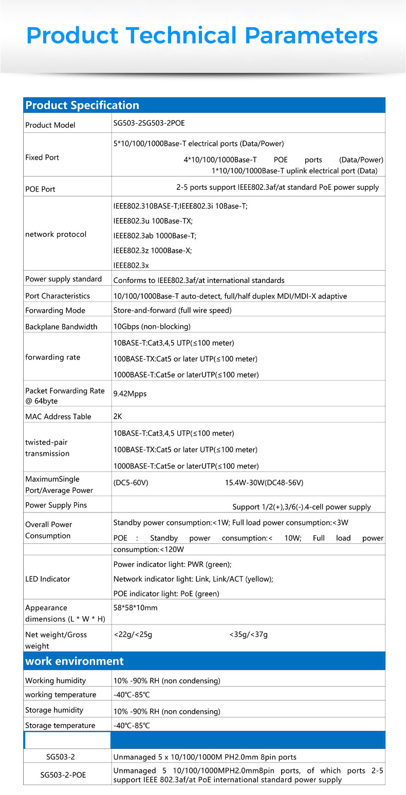 Unmanaged 5 10/100/1000MPH2.0mm8pin ports, of which ports 2-5 support IEEE 802.3af/at PoE international standard power supply |