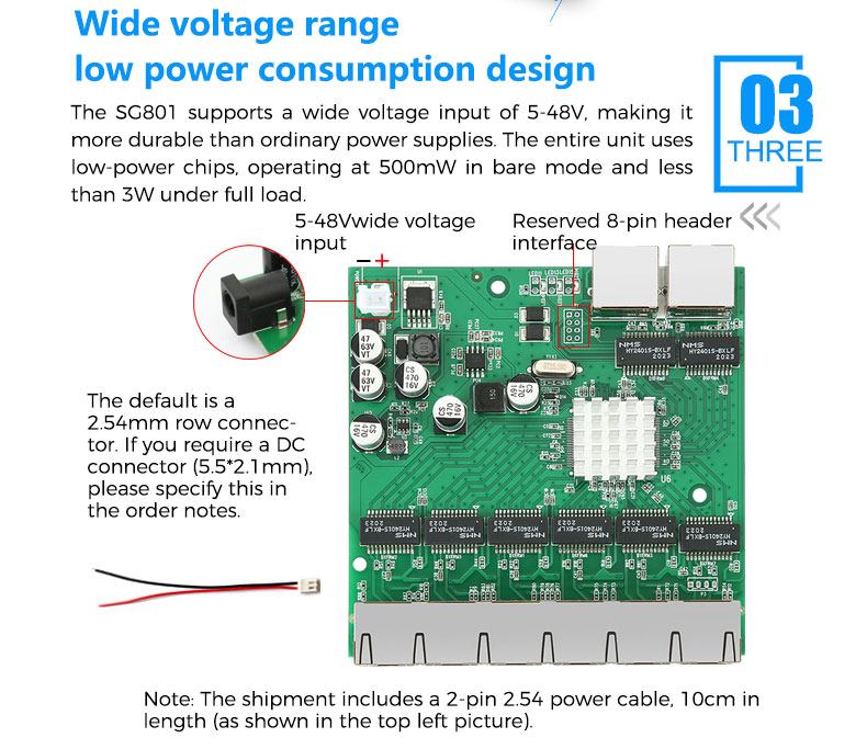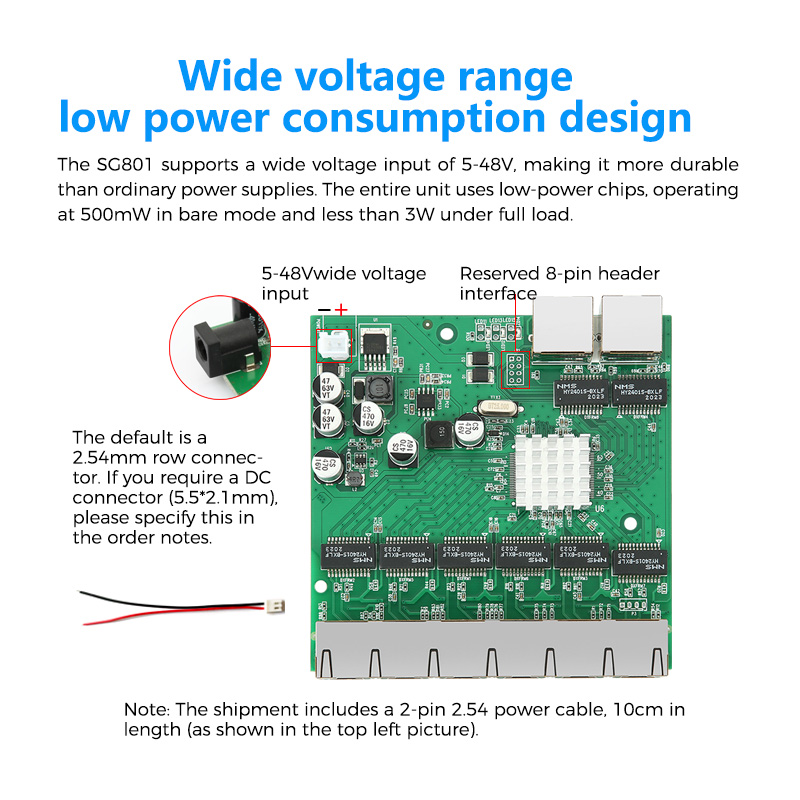 SG801 Series Non-Managed Gigabit PoE Switch Module Developed independently by Huasifei Technology, the SG801 series is a non-managed all-Gigabit PoE switch module equipped with 6 all-Gigabit auto-negotiation Ethernet ports and 2 additional Gigabit adaptive Ethernet ports. Ports 1–6 support both non-standard 5–52V and IEEE 802.3af/at standard PoE power supply, delivering up to 30W per port and a total PoE output power of 130W for the entire device.