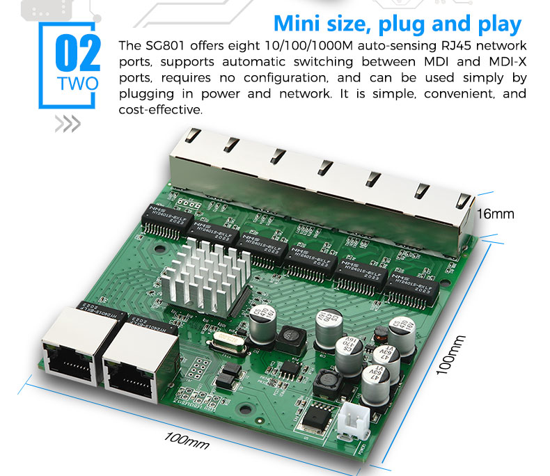 Supports 10/100/1000M auto-negotiation on RJ45 ports. Each port features auto MDI/MDIX crossover, eliminating the need for specific cable types.