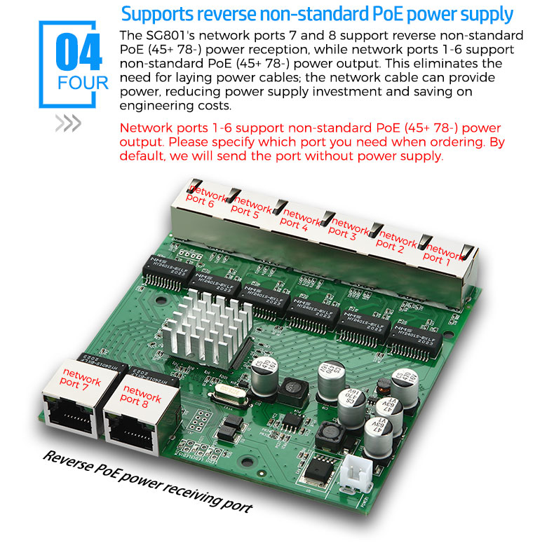 • Supports optional non-standard PoE or standard PoE power supply, with a maximum PoE port output power of 30W per port.