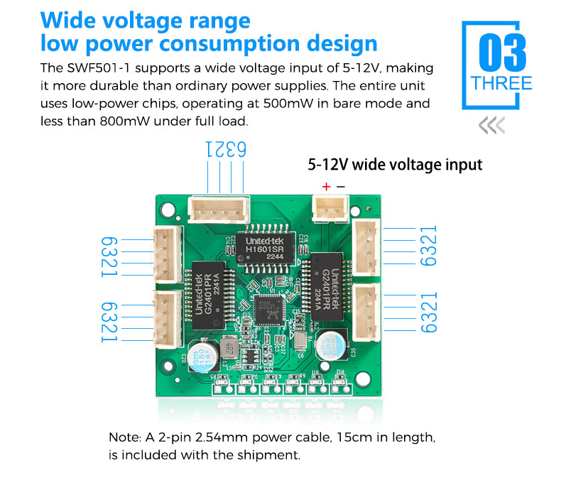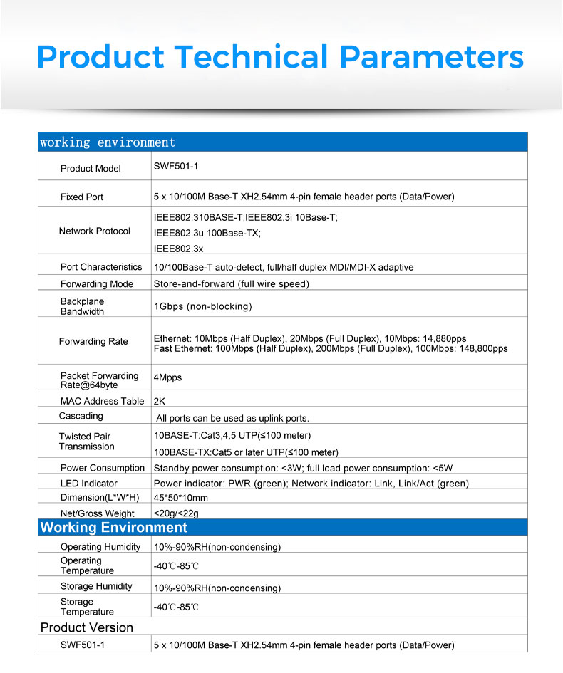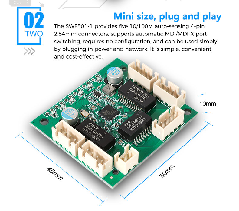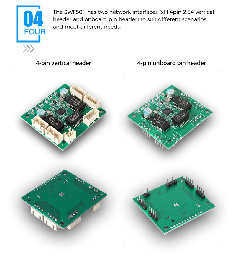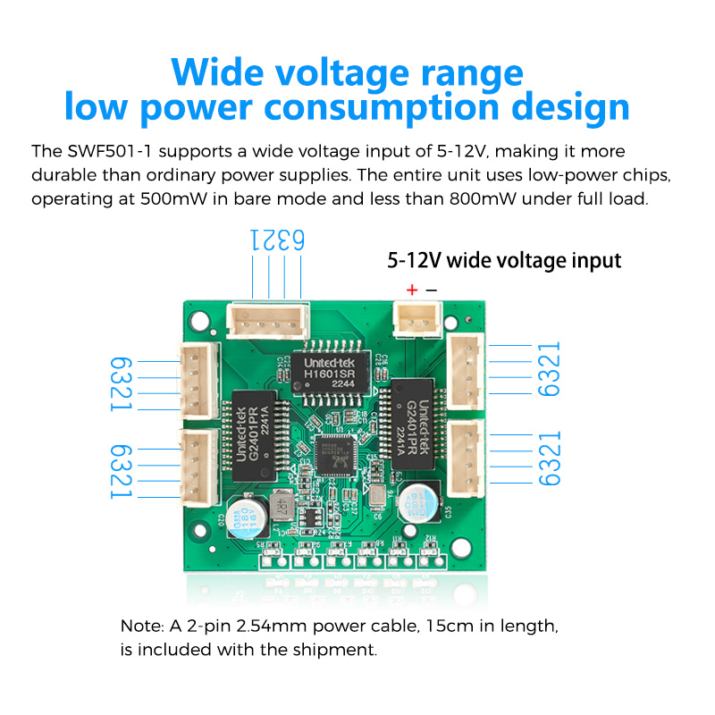 5 x 10/100M Base-T XH2.54mm 4-pin female header ports (Data/Power) |